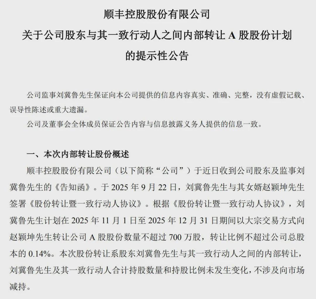 近日,顺丰控股公告称,公司股东及监事刘冀鲁与其女婿赵颖坤已签署《股份转让暨一致行动人协议》,计划在11月1日至12月31日期间,通过大宗交易方式转让不超过700万股A股股份%。